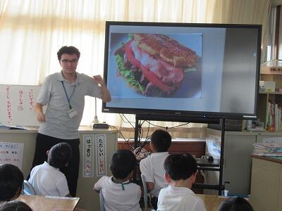 今日は、低学年の子ども達がはじめてディラン先生と外国語の勉強をしました。
