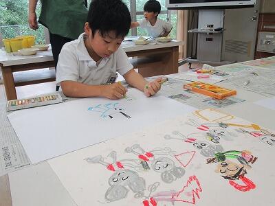 1年生は、図工の時間に、お気に入りの場面の絵を描きました。