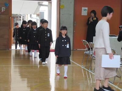 担任の先生を先頭に、式場に入場。やや緊張しているようにも見えますね。