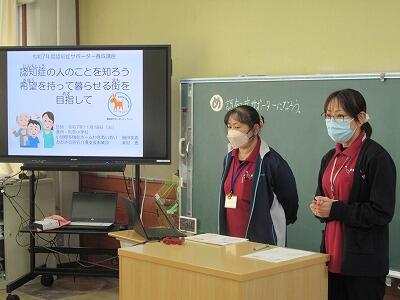 認知症サポートキャラバン 投稿: HP管理者 (17:53) 認知症サポートキャラバン 11月18日(火) 学習発表会の振替休業日明けの今日、4年生が認知症サポートキャラバンの方々から、認知症について学びました。 まずは、認知症とは何かについて知り、そのあと、症状や認知症の方への接し方について分かりやすく教えていただきました。 最後に、子どもたち一人一人に、認知症サポーターの証である、オレンジ色のリストバンドが配られました。 Tweet -