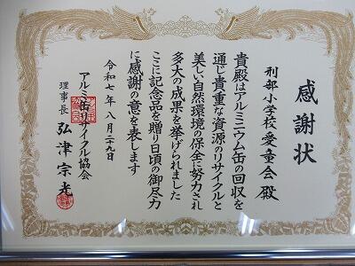 アルミ缶リサイクル表彰 投稿: HP管理者 (16:00) アルミ缶リサイクル表彰 11月27日(木) 本日、アルミ缶の回収を通じて、資源リサイクルに貢献した団体に、アルミ缶リサイクル表彰が行われました。 本校愛童会は、夏季休業中の資源回収を通じたリサイクル活動が評価され、感謝状を受け取りました(市内6団体)。 授賞式には、愛童会事業部長に参加いただき、表彰状と記念品を持ち帰っていただきました。 Tweet -